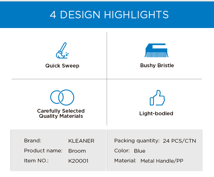 O K20001 é um complemento versátil para qualquer conjunto de ferramentas de limpeza doméstica , bem como kits de custódia profissionais. Sua cabeça larga cobre grandes áreas de piso rapidamente, reduzindo pela metade o tempo de varredura em comparação com vassouras padrão. As cerdas são quimicamente resistentes, permitindo o uso com diversos produtos de limpeza, como compostos de varredura ou pós para controle de poeira. A cabeça da vassoura inclui um pente embutido que remove cabelos e fios das cerdas após cada uso.